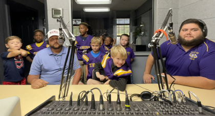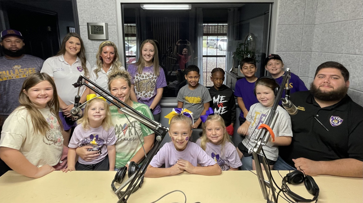 Tallassee Youth Football League players, cheerleaders and coaches in the studio after their first-round playoff wins in 2024