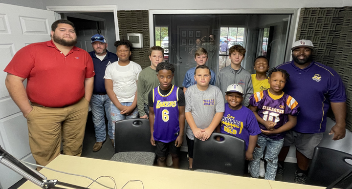 Tallassee Youth Football League players, cheerleaders and coaches in the studio after their first-round playoff wins in 2024